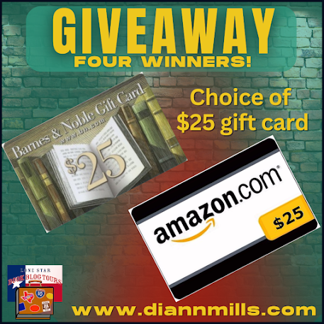 --------------------------------------GIVEAWAY! GIVEAWAY! GIVEAWAY!FOUR WINNERS:Each winner gets choice of B&N or Amazon $25 gift card.(US only; ends midnight, CDT, 9/1/23)