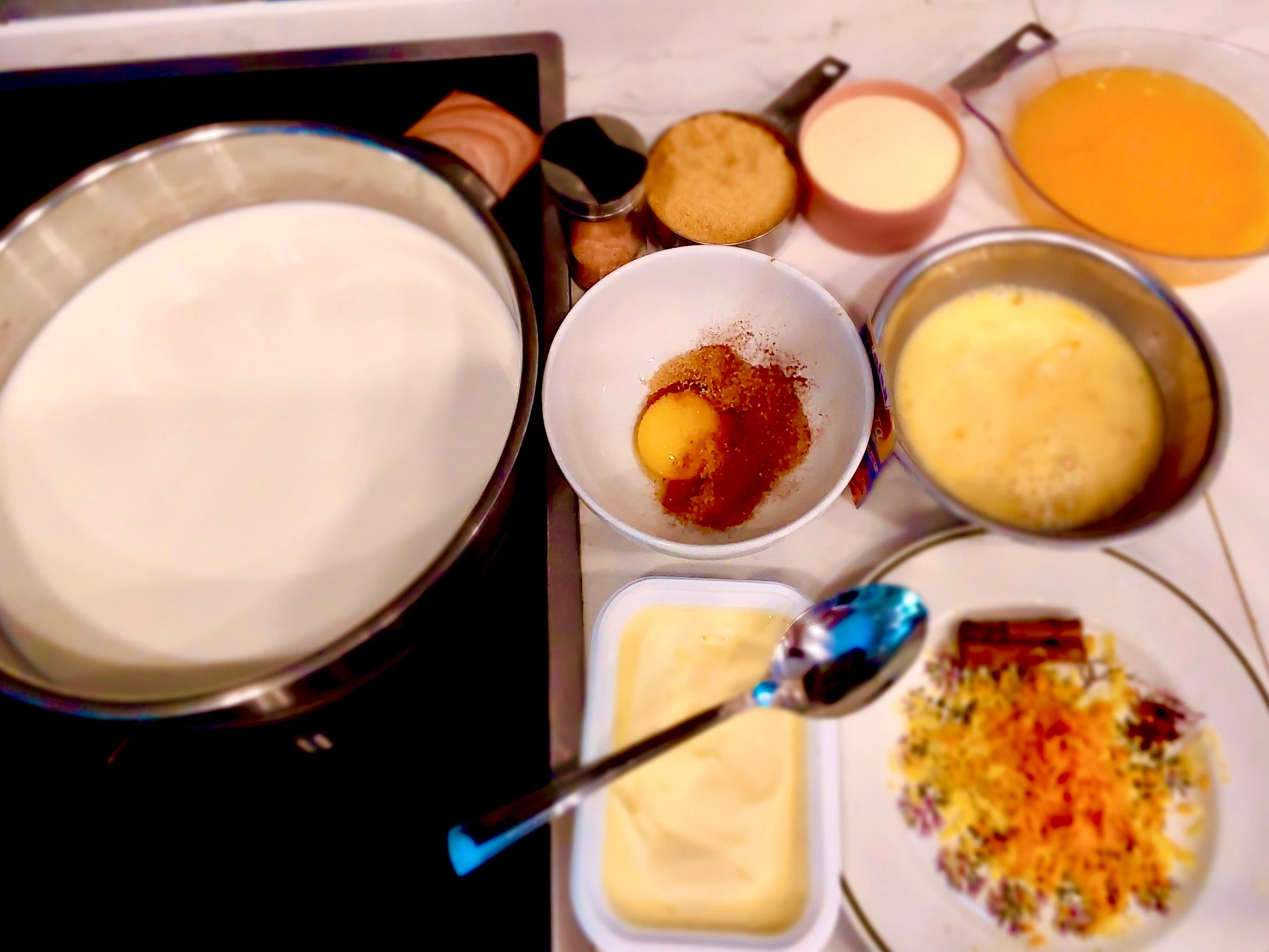 (The version with phyllo requires bottom and top layers of buttered phyllo and syrup poured on top after baking…much like the Greek Galaktoboureko filled with soft custard.)