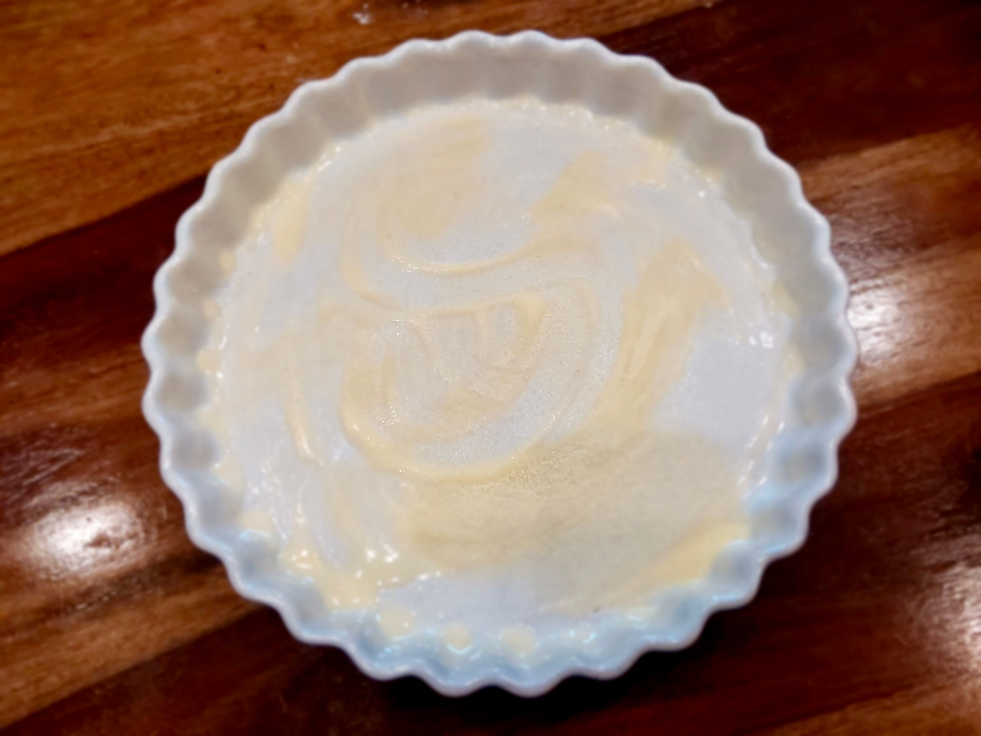 Butter a 27 cm round pan, quiche pan or square pan. Sprinkle the buttered pan with semolina.