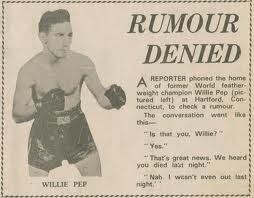 I've been a boxing fan ever since my dad took me to Buffalo's Memorial Auditorium to watch Willie Pep take apart an inoffensive chap named Walter Kolby. It was April of 1946, and I was coming up on my eighth birthday. Willie was 23, and at the time he'd been fighting for six years and would go on for another twenty. The ref stopped it after five rounds, and that was a mercy for Buffalo's own Walter Kolby, who hung up his gloves in 1952 and took a ten-count forty years after that.