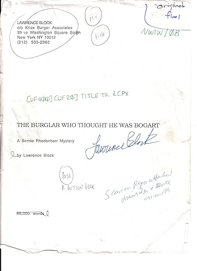 In 1977, Bernie Rhodenbarr made his debut in Burglar's Can't Be Choosers. In 1995, he had his seventh appearance in The Burglar Who Thought He Was Bogart. And eight years later, in late 2003, a woman in O'Fallon, Illinois, bought the original manuscript of Bogart.Last fall, I'm sorry to report, she passed away. And last week her daughter got in touch, and we arranged that I'd find a new owner for the manuscript. I've just posted it on eBay, with a minimum opening bid of 99¢.