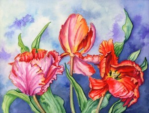 Eventually, I felt like a change from watercolour and mixed media, so I ventured forth into acrylic on canvas. No need for framing, you can hang them immediately, and I mostly have acrylics on my walls. I found the change tricky at first, because with watercolour you get a lovely fine point to your brush which acrylic just can’t deliver. The small sized brushes I like for detail need to be replaced regularly, so I buy cheap ones. Unlike with watercolour, which dries lighter, acrylic paint dries darker, so this took some getting used to when colour mixing, as well as learning to use a stay wet palette which is essential. I also had to get used to doing backgrounds first. But the benefits are the rich matt colours of real depth and substance.