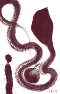 மாலையில் யெகோவாவின் ராஜ்ஜியத்தை அறிவிக்கும் சபைக்குச் சென்றேன். கொய்யா மரத்தடியிலிருந்து பைபிளை வாசித்த குங்குமம் என்னைக் கண்டதும் பரபரப்படைந்து மூடி மறைத்தான். என்ன குற்றமிழைத்தான், ஏன் பதறுகிறான். சிறியவர்களாக இருந்தபோது காகிதத்தைச் சுருட்டி பீக்காட்டில் புகைத்த பீடிக்கு கூட அஞ்சாதவன் குங்குமம். என்னை அமரச் சொல்லி கதிரையை எடுத்துத் தந்தான். “பைபிள் என்ன சொல்லுகிறது” என்று எழுதப்பட்ட புத்தகமொன்றும் இருந்தது. காவற்கோபுரம் வண்ணமயமான சஞ்சிகை. ஒருமுறை விக்டர் பிரதரிடமிருந்து வாங்கிச் சென்றேன். ஏதேன் தோட்டத்தில் கனியுண்ணும் ஆதாமும் ஏவாளும் கண்சொருகி தித்திக்கும் கணத்தை வரைந்திருந்தார்கள். பாம்போ அதனை வேடிக்கை பார்த்தது. பாவத்தின் விளைவுகளை அறியாத மானுடரின் மூதாதையர்களை கையிலேந்தியபடி வீட்டுக்குள் சென்றேன்.