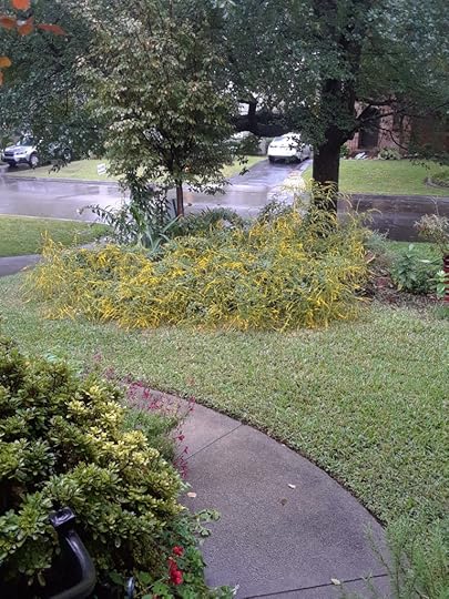 Look at that tangle of goldenrod! If it weren’t raining it would be covered with bees. I’ve also found the cat hiding under the arch of branches, hoping birds will land near by. Right now she is on a chair cushion on the porch. A much drier perch with a good view.
