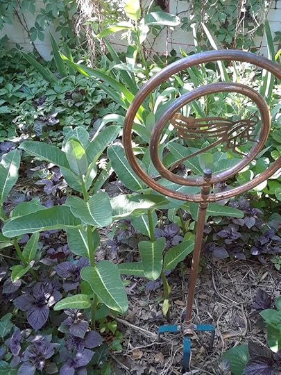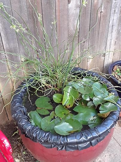 And somewhere in this water pot there is still a goldfish from last year. Feel free to eat ALL the mosquito larvae, please! Also note the corkscrew rush is ‘blooming’. (See ‘fuzzy’ tips)
