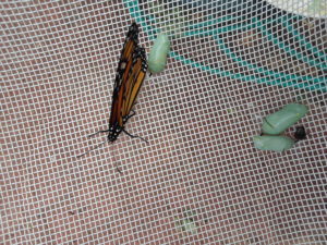 And if I’m to judge by the color of the remaining five chrysalises, there might be two more tomorrow. (They turn transparent and you see the dark colors with streaks of orange. See corner of the third picture above.)