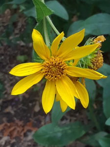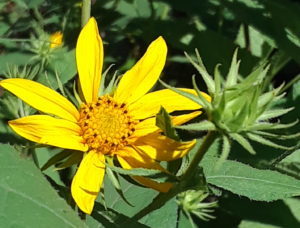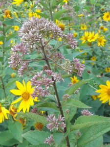 Then we have another new comer for the summer flowering. Native to the Oklahoma plains is Ironweed, Vernonia. Looking it up, it should be a ‘butterfly magnet’ but no attraction as yet. It is a nice stand and has goldenrod as a companion plant, but no flowers open on that yet. The last picture is the miscellaneous ‘sunflower’ type which I photographed earlier this summer, but it is taking over the back yard. I think this will get a ‘hard’ pruning when it looks like the flowers are done, although I suppose its seeds might be food for someone. I do know that I’ll not let it get much bigger next year as it is thuggish. It is a vigorous plants, but! I did cut a few stems of this ‘daisy’ for a vase in the kitchen and they are holding up well, so perhaps I should just whack away at it for house flowers. It is nice to have something you can cut freely.