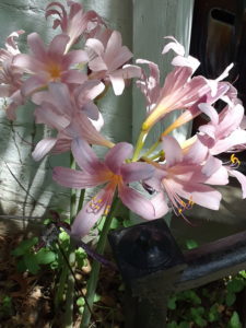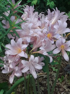 The first is the Oklahoma plant I find the most amusing…”Naked Ladies.” They are of the amaryllis family. They send up strapping leaves first thing in the spring and the leaves disappear…then they send up the flowers in July. The time between these two events is just long enough for the gardener to forget where they are and accidently dig them up when planting something new… They have several names but the ‘naked ladies’ name comes from the fact when they show up to flower in late July they don’t put out any leaves only the ‘naked’ flower stalk is evident. And they are beautiful, so they are ladies. For a hardy plant for the dry, plains they can’t be beat. These two stalks are the first up this year. I have them in several places around the yard, but don’t see evidence of them else where. It might be that this spot got ‘watered’ as I took care of plants on the porch making them the advanced guard.