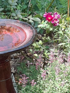 The picture next to it is the newest birdbath. I bought one like it one of the first summers here and darned if the bowl didn’t get broken by a falling limb. I’ve repurposed the base of that for my sun dial. Also in this picture is a rose called Ebb Tide. It is a purplish red. It merits a picture because there was a hummingbird at it when I walked out this morning. Second hummingbird in two days, so they are around. The other was at the feeder by the kitchen window. If I can get so lucky, I hope for a picture of a ‘hummer’ sometime.