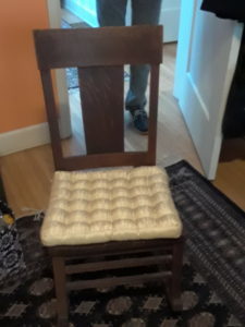 Item One – Above is a rocking chair that my parents gave me. I’m pretty sure it is Arts and Crafts/Mission style. So what’s so special? Family Heirloom? No, don’t know where my mother found it. What you can’t tell from the pictures is it pretty short (low). You can see that there are no arms, which is unique, but makes sense if you know that there is a pull-out, pivot drawer under the seat that has pegs for spools of thread and such. It’s a sewing chair. Can’t be too many of those out there, can there?