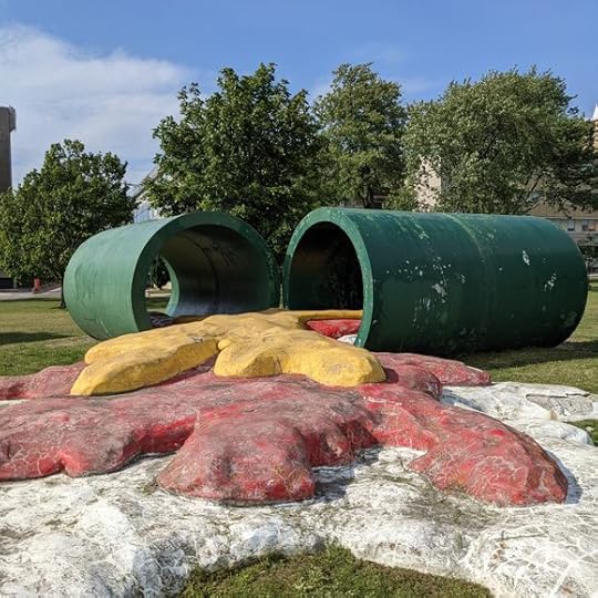 A similar idea is behind the civic sculpture “Pollution,” that has graced the Kingston, Ontario waterfront since 1973. It is just two large green concrete cylinders vomiting forth a formless mass.