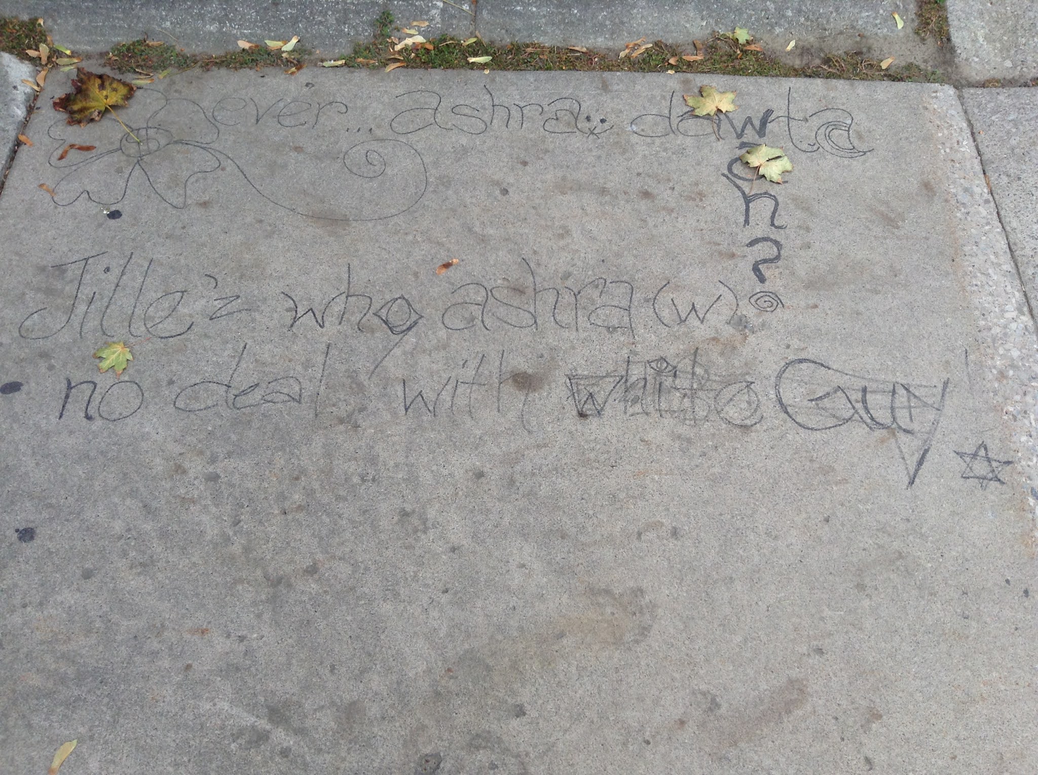 From my walkabout today, evidence of the growing climate of racism. Most of this is indecipherable, but the last line is "no deal with white guy."