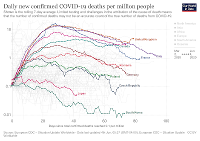 We are probably far enough into the outbreak now to declare some winners and losers. The chart shows the death rates per capita by seven-day average for a selection of countries: the developed “G7,” plus other countries in Central/Eastern Europe and East Asia.