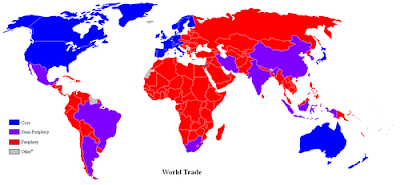 The text divides the world into “core” and “periphery.” These are all the same countries we used to call “developed” and “underdeveloped” or “developing.” Except, of course, that there are more developed countries now than there used to be.
