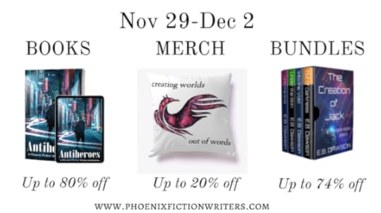 Sooooo, my favorite group of indie authors ever (if you haven’t heard of the Phoenix Fiction Writers by now you’re either new or you’ve not been paying any attention) holds a sale every year, so you can get a good number of their books and their merch at a significant discount. If you’ve been procrastinating on getting one (or more) of their books, now is the time to stop putting that off. If you’ve read their books and/or think friends or family members would enjoy them, now is a great time to order Christmas gifts. Or, if you just want to expand your collection (does anyone else have a PFW collection? No? Just me?), now is a great time for that, too!