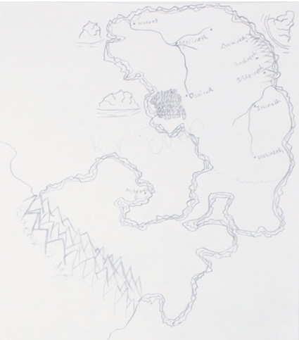 This is how I got the shape for Kaloris, and it worked really well. Pour rice onto your paper, manipulate it as desired, and then trace around it with a loose hand. You’ll end up with shorelines that look like this: