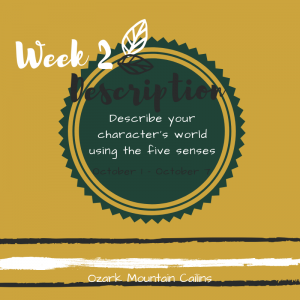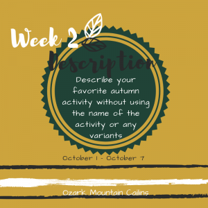 I intended to do these on the days they were posted, but I forgot so I’m doing all six at once. This past week’s category was description and was hosted by RaeMarie at Ozark Mountain Cailins. (Click on the prompt graphics to go to the original posts.)