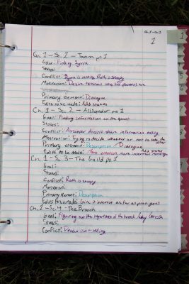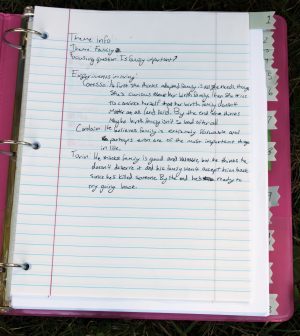 The first thing in my binder is a document that has info on the theme I want to incorporate. When I wrote this book I didn’t have a theme in mind, which resulted in the story falling flat (well, that and the fact that there were no stakes… but we’ll get to that). Fortunately, since I’ve recently learned about theme, the information is fresh in my mind and I was able to fairly easily pull out a theme I could target and write down the info I needed. This is the basic theme (family), the question that more focuses the theme (“Is family important?”), and then the “experiments of living” for each character, which is what they believe in regard to the theme and focusing question.