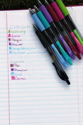 Next is my color code. I did some research on this prior to developing my color code to find out what sorts of things other people marked (I’ll post links to the articles I found at the end of this post), and then commandeered my mom’s colored pens and developed my own. These are Pilot G-2s and they’re my absolute favorite variety of pen. They write really smoothly and they come in a variety of colors and I highly recommend them.