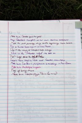 After I printed out the whole book I read through it once all in one sitting (all 155 pages of it) and I made notes of some issues I saw with it to begin with and wrote them on this list, using my basic color code (the one on the bottom). There were some important plot threads that got dropped, as well as some lines I wanted to relocate, a scene I’d cut that I wanted to reintegrate, and a couple of spots where payment should have been and wasn’t, and I also want to look at the dialogue throughout and make sure it sounds natural (I might enlist the help of my sister to act out scenes with me to test that). And I’ve also added to this as I’ve gone through it to do my scene-by-scene notes.