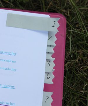 I actually hate these tabs for this purpose, but I have tabs on the first page of each chapter. The problem with these particular tabs for this purpose is that they don’t stick far enough up/down the thing, so you can’t use them as a handle to flip to a page and they come off pretty easily even when you don’t use them as handles. But they’re still better than nothing, and they’re also helpful if I want to look from the side and see the rough length of each chapter. Chapter six, for instance (the one I just finished), is twice as long as any of the five before it (at least as far as scenes are concerned). I would definitely recommend using tabs to mark chapters, but I wouldn’t recommend this variety, lol.