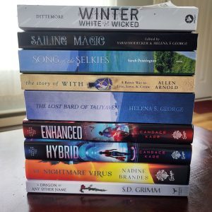 I bought books! I mean, how could you not, at Realm Makers. Winter White and Wicked came in before Realm Makers–I was about halfway through during the conference–and I came home to my copy of The Nightmare Virus, but everything else on the stack was purchased at Realm Makers. I limited myself almost entirely to books I’d already been planning to buy at some point anyway, with a couple exceptions.