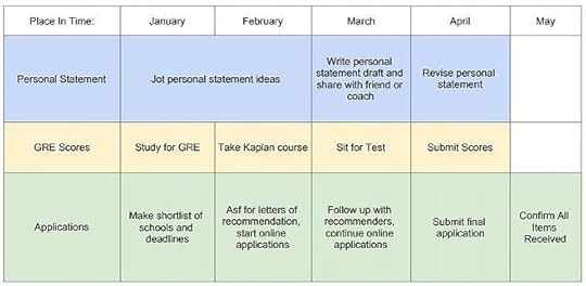 Now that you know exactly what’s involved in achieving your goal, you’ll actually put all the steps you listed into a timeline. First decide the timeframe you want to achieve this goal in — is this a six-month process or a six-week process? Be realistic about this, taking into account how long each task will take you and how much free time you have ahead. Then start organizing your tasks into time slots. The final outcome should look something like this:
