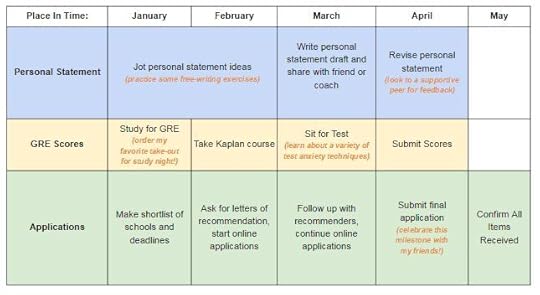 That way if your mind wanders, which it inevitably will, this brings it back to you. I encourage you to make your timeline really attractive. As a psychologist, I know that the colors we use, the way we space is organized, the way a paper is organized. It helps us to adhere to it, and to feel like it’s fun and that we’re organized.