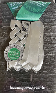 The picture is of the medal I received for finishing the Ring of Kerry. Each challenge has its own special medal and the one I received is hefty. And best of all, it arrived promptly. Unlike the first company who shall remain nameless. Grrr.