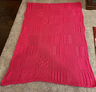 Knitting an afghan is usually a really tedious thing. In fact, I've failed at it, putting one I was trying to make into hibernation because it was soooooo boring.This afghan wasn't boring. I don't know if you can tell in the pictures, but even though it's knit in one piece, it's setup like squares. They have different patterns, and after 36 rows of knitting, it changes to the next pattern. Plus cables!