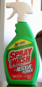 The bottle of Spray and Wash says to “Rub Spry N Wash Laundry Stain Remover into the fabric…wait 1 to 5 minutes then launder in the warmest water.