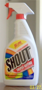 The bottle of Shout says to “completely cover the stain…rub the formula in to penetrate stain. Wait 1-5 minutes (just like Spray and Wash) and launder with the warmest water the fabric will accept.