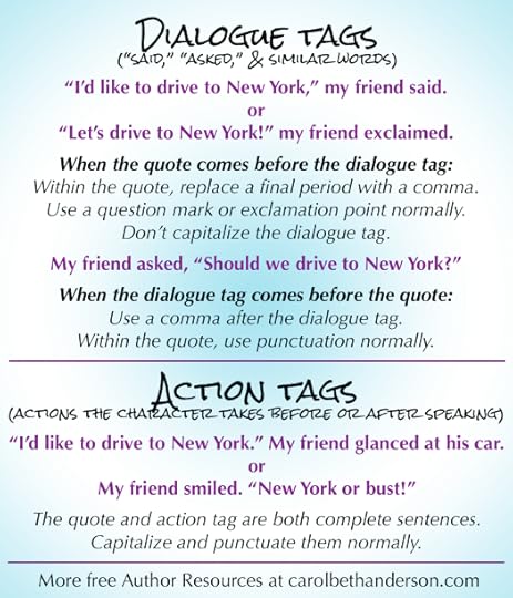 Example 4: “I’d like to drive to New York.” My friend glanced at his car.Example 5: My friend smiled. “New York or bust!”Action tags are complete sentences, unlike dialogue tags!Punctuate the quote with normal punctuation within the quotation marks.Punctuate the action tag with normal, end-of sentence punctuation.
