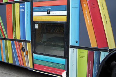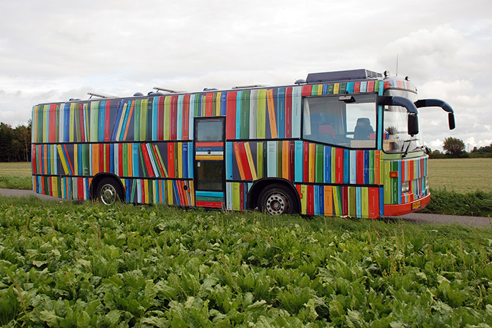 Peter Callesen has recently been working on the decoration of a public library bus, which is a commission work for the Danish Art Council in collaboration with the Borough of Guldborgsund, at Falster in the southern part of Denmark. First Peter Callesen has photographed around 500 different books from the local library, He then asked the local residents of the area to come up with their own titles for books, which he afterwards exchanged with the old titles. This has resulted in around 500 different authors and made-up titles, which now embellish the exterior of the bus in a mosaic pattern of books in different bright colors. Some examples of the book titles: