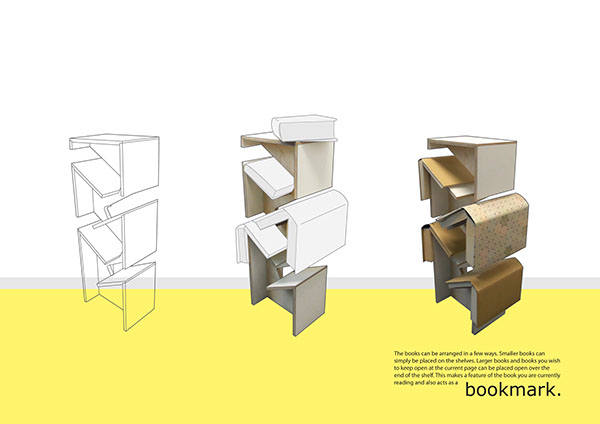 The books we are currently reading can easily be misplaced or the page lost. This slimline bookcase can solve these problems. The bookcase stores a minimum of four books, holding them open at the current page. This makes a feature of the book you are currently reading and also acts as a bookmark.