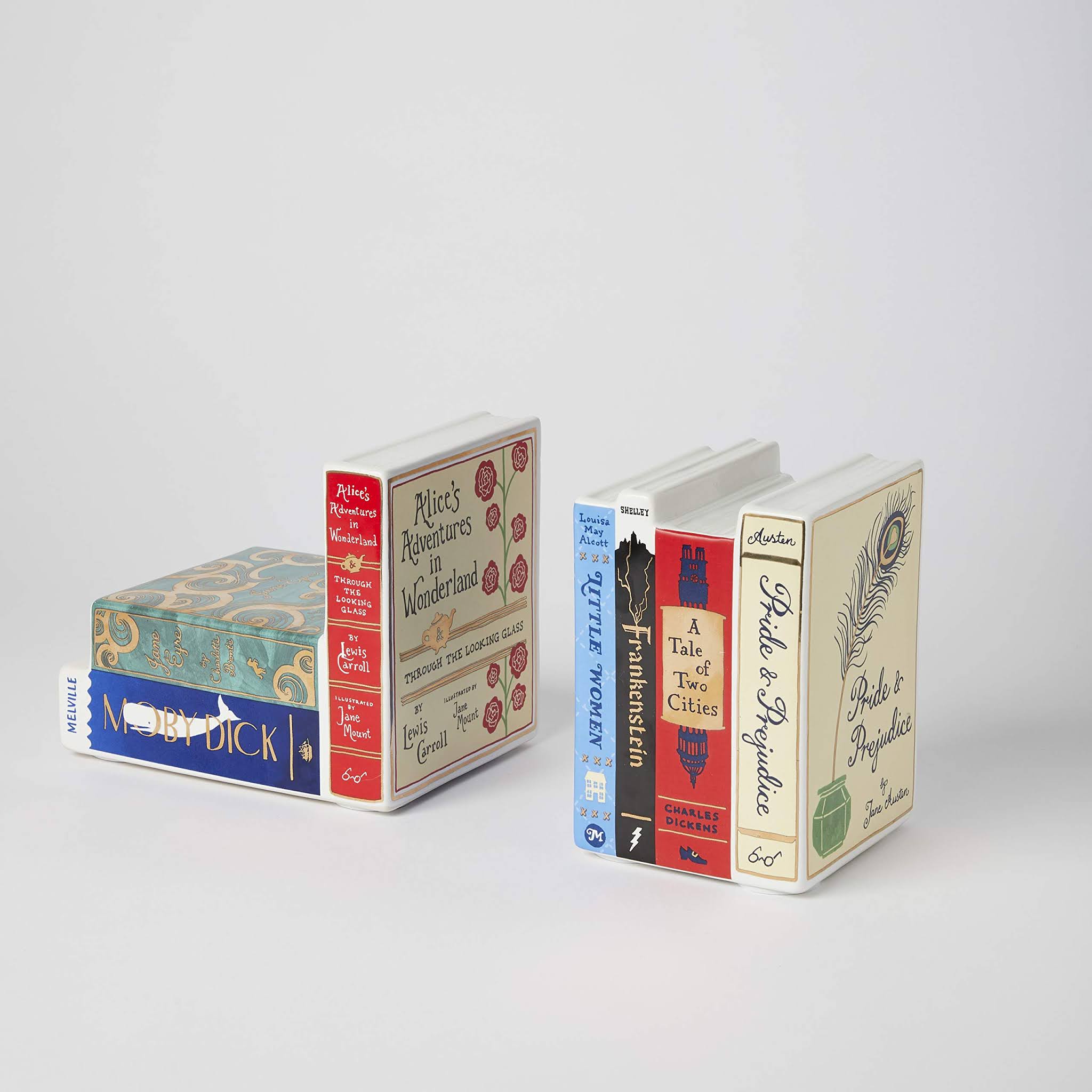 An essential addition to the bibliophile's library! These charming, colorful bookends feature hand-painted book covers, featuring the timeless novels Pride and Prejudice, Alice in Wonderland, Moby Dick, Frankenstein, A Tale of Two Cities, Jane Eyre, and Little Women. The artwork is printed on durable, weighty ceramic bookends with non-skid pads for a winning combination of form and function.