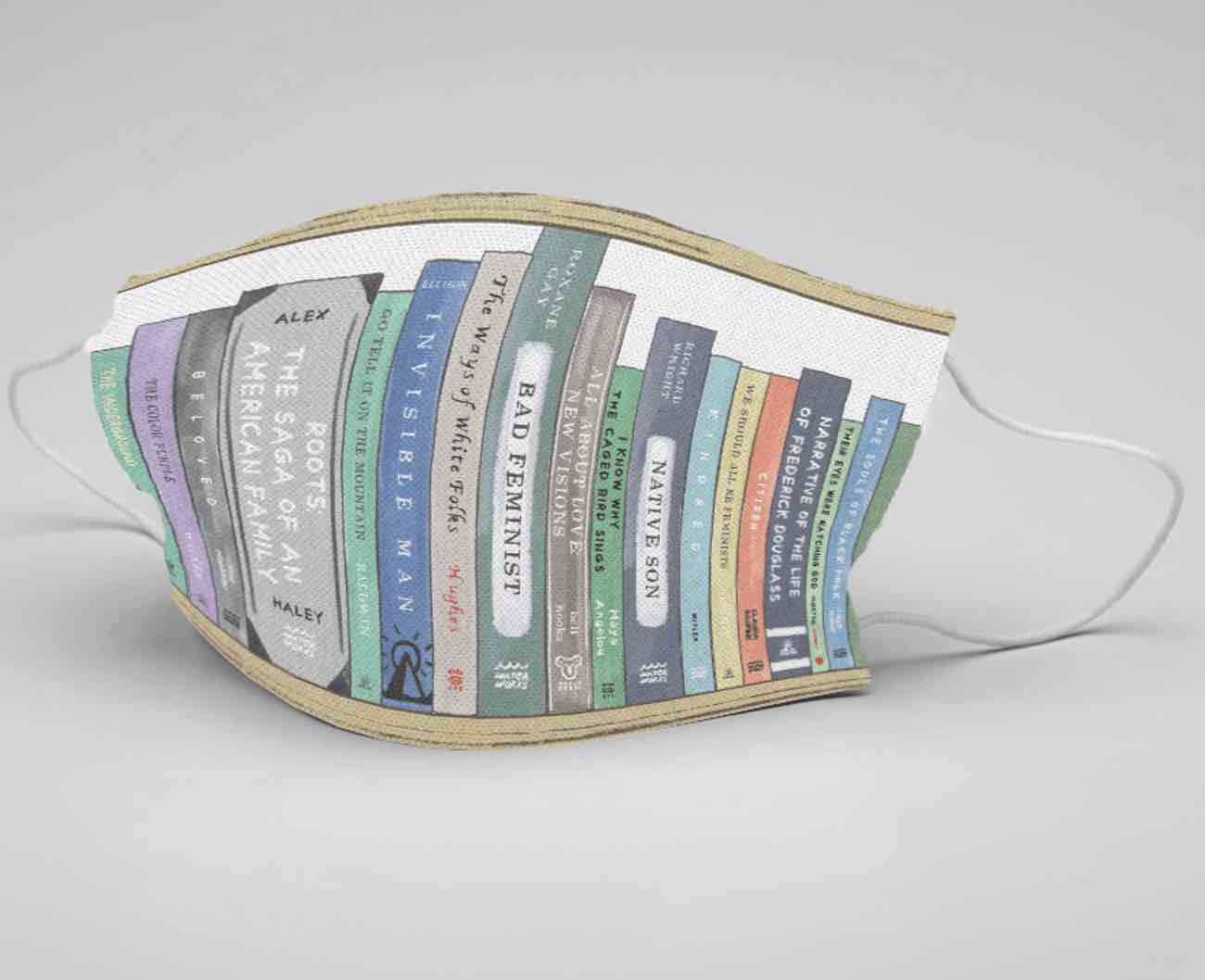 Features a shelf of classic and contemporary books written by Black authors. All proceeds from the sale of this product will be donated to causes dedicated to improving diversity in publishing and bookselling. Each mask contains two layers: an outer layer of tightly woven, printed polyester, and an inner layer of cotton. The ear loops are a soft, stretchy material to keep your mask snug without hurting your ears. Each mask measures approximately 8" across and 5" tall in the middle, with pleated edges.