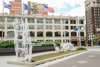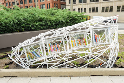 "I wanted to design a sculpture that would draw attention to books, the importance of literacy and outreach, and the book sharing system. The sculpture is a series of linear vine forms that suggest growth and development, a kind of topiary composition that wraps around an existing planted garden space on the trail. Thus, these sculpture forms emerge from the garden space and suggest that reading is another form of growth." Eric Nordgulen