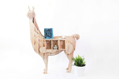 Plywood CNC milled Llama with three cut outs for books or plants and one shelf.