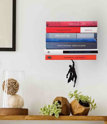 A special bookshelf that gives a 'floating-on-air' feeling. The superhero character seems to easily stop the books from falling down to the ground.