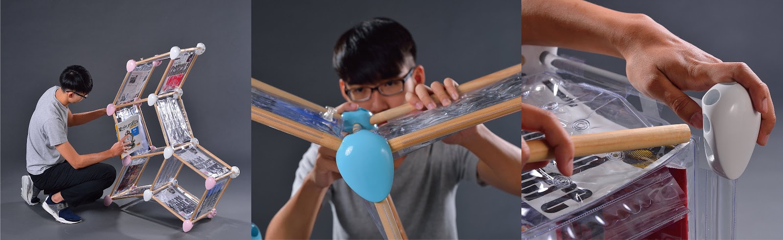 There are so many wonderful memories in books, like some serious notes or interesting graphic. These memories are worth to come back to review and watch constantly after we grow up. Therefore, we focused on how to preserve the memories, thinking out how the eliminated textbooks can be combined with life. Save memories, simultaneously, giving them new functionality. "You can hate exams, but do not hate reading." We hope that with our design, an adult can still learn to keep reading habits. Use the natural shapes to brainstorming and thinking ideas, produce cornerstone which can extend to all directions and combination. The core, we call “Emerald” has 8 hole around a circle can provide consumers freedom to build up many different kinds of bookcase.
