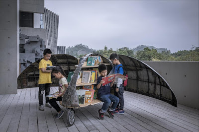 "The interior spaces for displaying items are flexibly partitioned into several smaller storage areas by plates which can be freely adjusted according to users' needs. Besides, all the partitions can also be removed, through which a complete big space will be formed. The installation can be customized based on different needs, making it versatile and "universal"... The Shared Lady Beetle, is like a "beneficial insect" walking on the "urban leaf ", which can be used as a mobile library , a stall, or a maker classroom for kids, etc."
