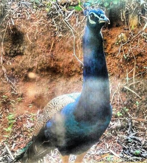Not so much an alarm clock since he was silent and didn't knock on the window but this morning's feathery visitor was a bird everyone knows. Never been this close to a peacock before so took a moment to admire his kohl lined eyes, his crest,his long neck. Surprisingly we can't hear them in the forest behind us at all, only occasional sightings to remind us he exists. #peacock #goanway #birdwatching