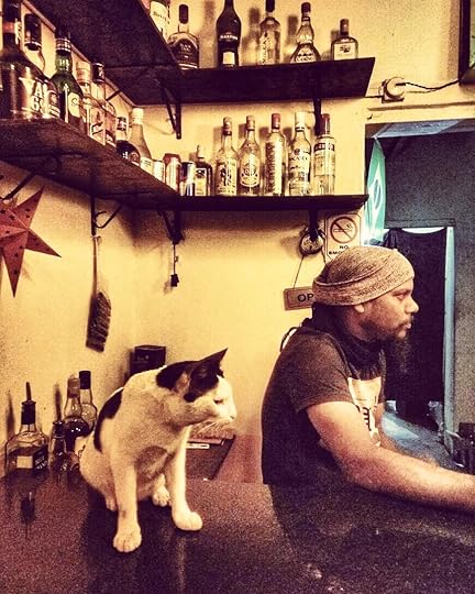 This morning we discovered the reason there was a faint smell when we showered was because there was a drowned squirrel in the tank. Much later, after practically scrubbing our mouths out with hand sanitiser (not really), I'm sitting at home, reading on the balcão, while the long laborious process of cleaning the tank happens. Hence the #latergram of Rock Pub, with Mr Rock (not his real name) and the nine year old cat who likes to hang out at the bar too. Tell me again how glamorous my life is. #goanway #alcoholisbetterthanwater
