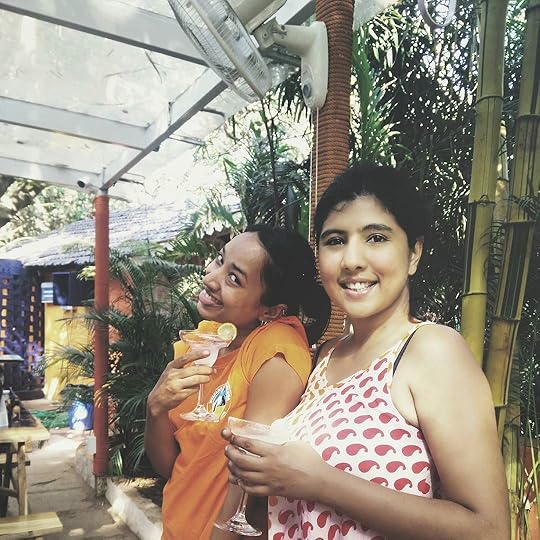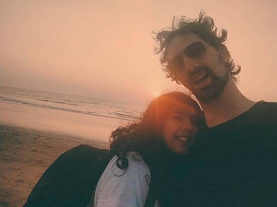 We make funny faces after a day of writing at a beach shack. Short one and tall one. We're happy. Sea in the background, sunset bursting into my hair. #goanway #meandyou #morjim