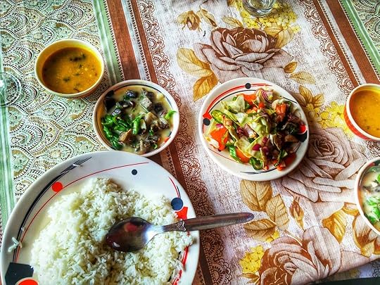 Wandering about Thimphu today and stopped off at a divey little place for a traditional meal. That's the fiery chilli, cheese and beef curry, some daal from Southern Bhutan and salad. The owner put us on Skype to talk to all his various relatives. #bhutan #traveldiary #mountainechoes