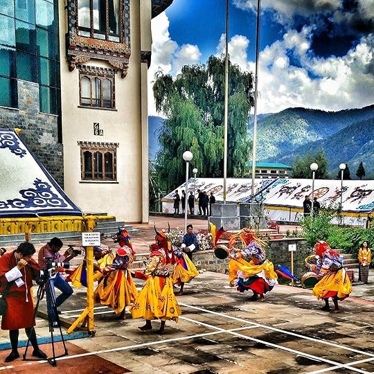 Traditional dancing during the tea break. There were these two guys wandering about wearing masks and carrying giant wooden phalluses. One strolled next to me as I tried to get a WiFi signal and said "hi dear" holding out his, um, PROP. he went away after I tried and failed to take a selfie. Oh well. #mountainechoes #traveldiary #bhutan
