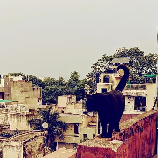Black and grey mornings. Have had to deny cats terrace access till they finish up next door and we can net it properly but every now and then we feel bad for them and let them scamper about. Here's Squishy, surveying. #catsofinstagram #squishytheblackcat #catsofdelhi