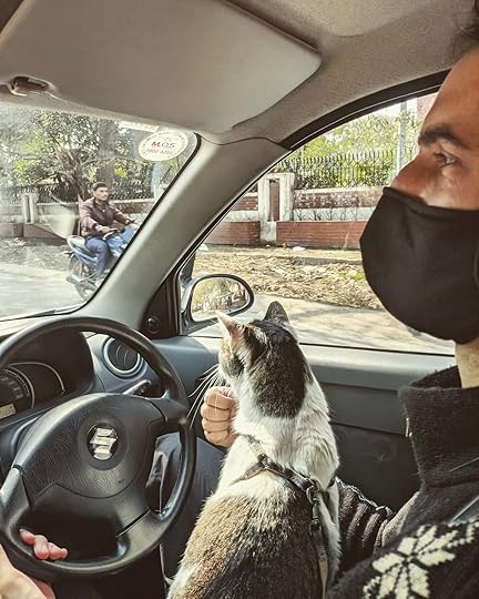 We are talking of moving, so we took Bruno to be microchipped, which is necessary for his "passport." We don't have details on plans yet so don't ask, but I'll tell you Bruno hated the cloth sling bag cage we put him in, which I personally love because it's so much easier to carry than the regular plastic and metal carrier. So he yowled and scratched and pushed against the plastic net with his face and paws until that - - being made only for geriatric cats or very small kittens, I think--tore easily and he walked around the car, and finally settled down on K's lap to watch the world go by. Eventually, at the vet, K slipped the harness on him and in he went, docile and like he had never been that angry cat scratching at his cage. #catstagram #brunothetabby #carpet
