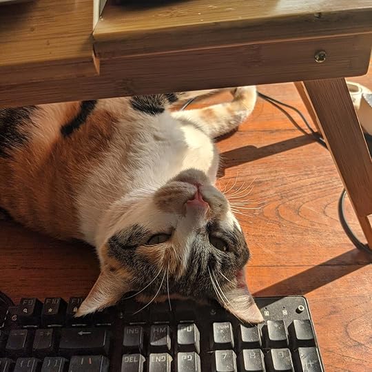 Literally impossible to get any work done because she keeps lying on my keyboard and being cute. (And yes, because I've gotten a zillion questions about this before: it's a mechanical keyboard and it's by a company called Redgear, I've had it for about two years now and I love it because of the clickity clackety noises it makes when I'm typing, I don't know how much it cost because K gave it to me as a birthday present but he got it online.) #olgadapolga #wfh #colleagueswithfur